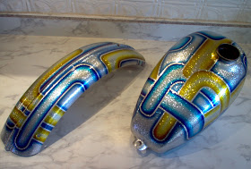 Here are a few more pics of the Cadillac roof. It's been about 3 years since I've painted on a car and about 6 since I've flaked a car. Motorbikes are what I really like to paint, but ya gotta hook your friends up sometimes. And it's a super cool car that really need a little something on the roof. Now he better gets some Supremes and drive that bitch!